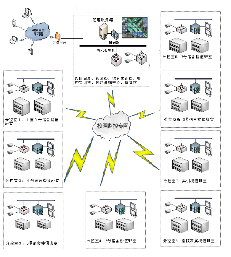 (1)分校區(qū)現(xiàn)有的監(jiān)控點遍布學(xué)校各個重要點位,包括教學(xué)樓、一體化樓、實訓(xùn)樓、辦公樓、學(xué)生宿舍、學(xué)生食堂、校內(nèi)重要場所等。通過光纖鏈路將前端各個點位匯聚到監(jiān)控中心,并統(tǒng)一傳到監(jiān)控中心集中存儲。