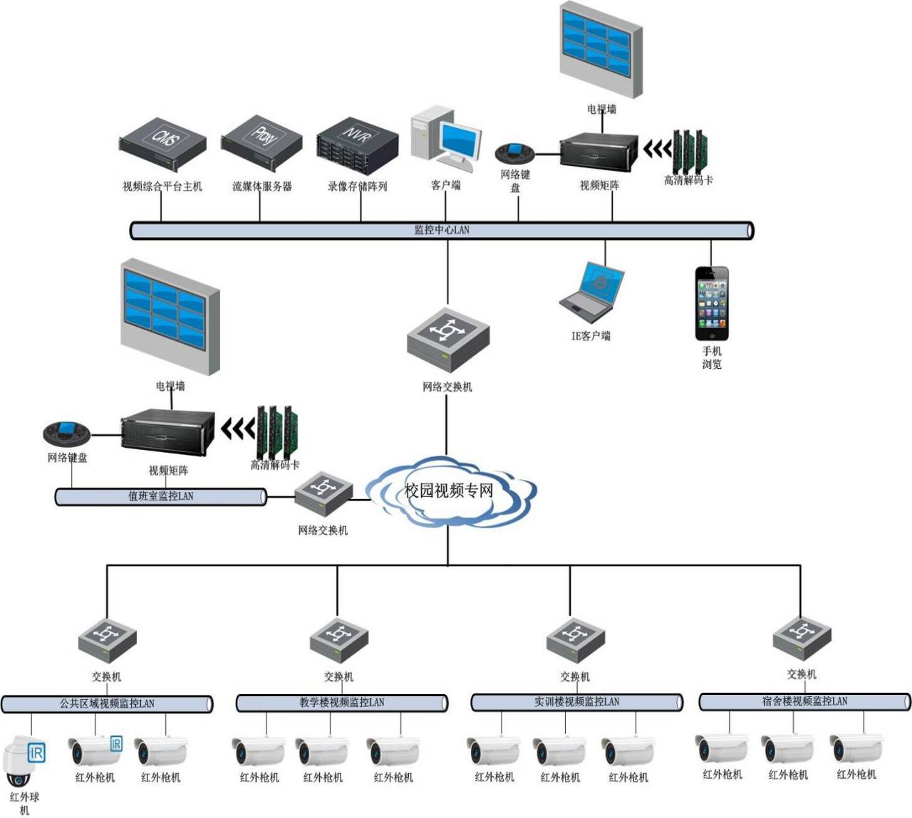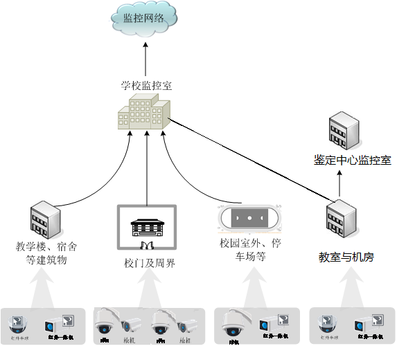 (5)視頻監(jiān)控系統(tǒng)主要由前端攝像機組成,根據(jù)現(xiàn)場不同的環(huán)境和應(yīng)用選用不同的攝像機,在出入口選擇紅外攝像機,在樓梯口和走廊設(shè)置紅外槍式攝像機及寬動態(tài)紅外攝像機,在周界可以選用紅外槍式攝像機,在學(xué)院室外開闊區(qū)域選用室外球型攝像機等。